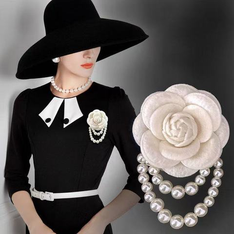 RYL White Camellia Brooch Women Retro Scarf Buckle Girls Pearl Brooches Elegant Jewelry Accessories for Garment Accessories